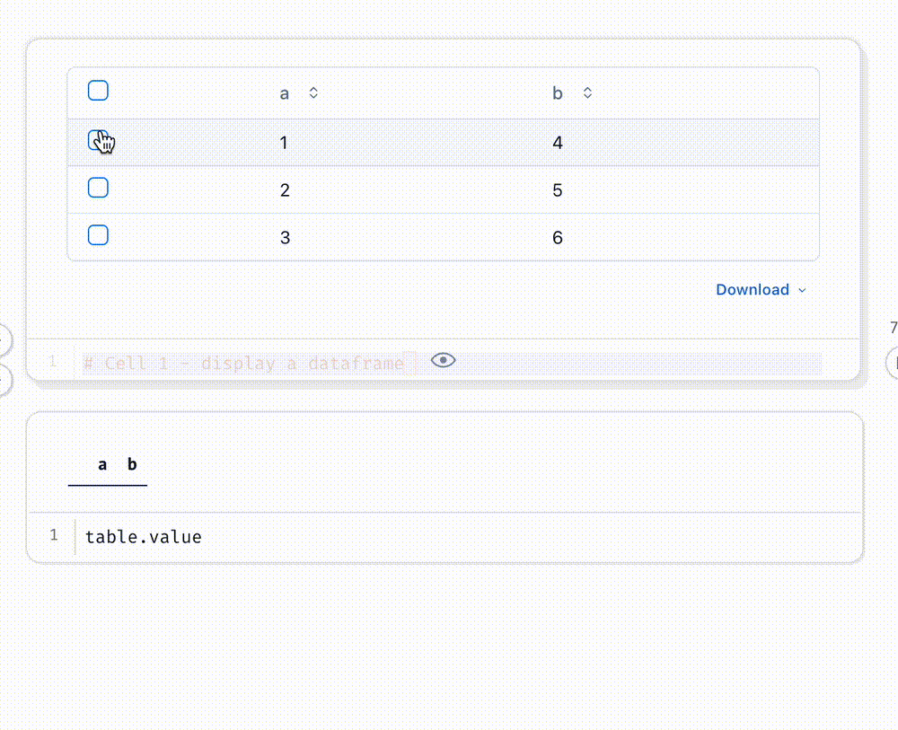 Select data from tables or charts and get selections back as dataframes